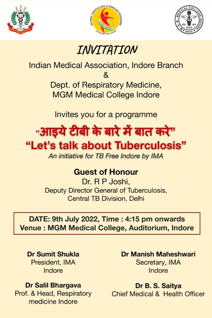 Dr. K. B. Saitya Chief Medical Officer expressed gratitude to the guests present. The program was conducted by Dr. Salil Bhargava Professor and Head TB and Tuberculosis Department. The city of this program has many well-known doctors Dr. Upendra Soni, Dr. Praveen Dani, Dr. Vijay Chhajlani, Dr. Arvind Jain, Dr. Vijay Chhajlani, Dr. Rupesh Modi as well as doctors of Indian Medical Association, General Practitioners Association, NGOs working in TB. Many dignitaries from CETI, Operation Asha, Adarsh Jan Seva Sansthan, and GLRA India were present.
