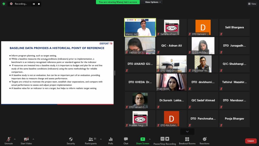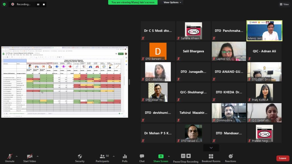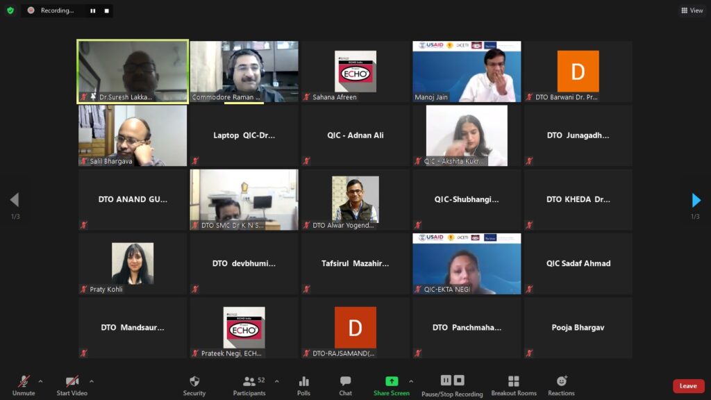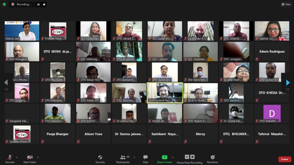 The weekend workshop on 08 and 09 May 2021 were mega sessions of five hours overall duration. The sessions were oriented towards Quality Improvement processes especially the PDSA technique. Though they were originally conceptualised to be in-person weekend sessions but due to ongoing covid-19 protocols were converted to virtual interaction. Despite being a weekend, the active and wholehearted participation by the DTOs was most encouraging. The technology of breakout rooms was largely utilised to give the QICs and their respective DTOs private space to practice the various steps involved in PDSA. The DTOs then made presentations and shared their experiences.