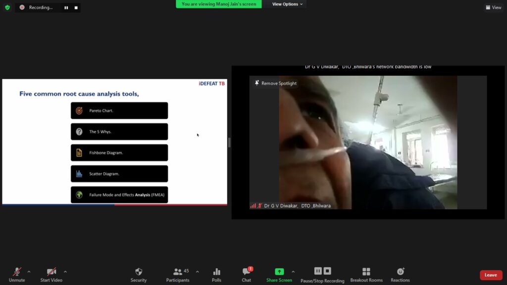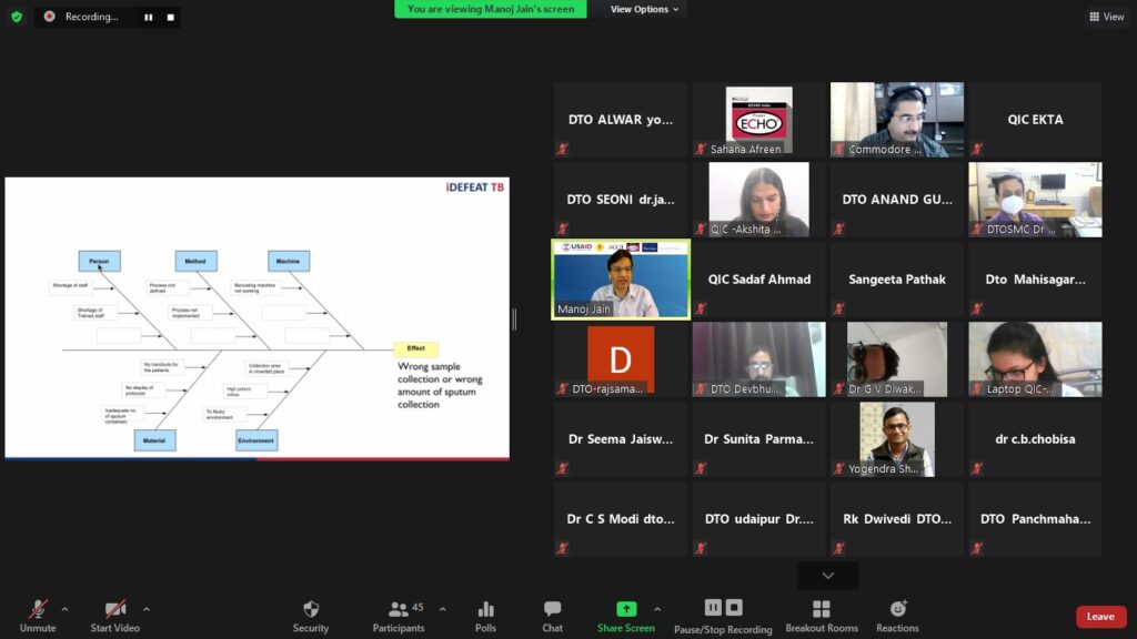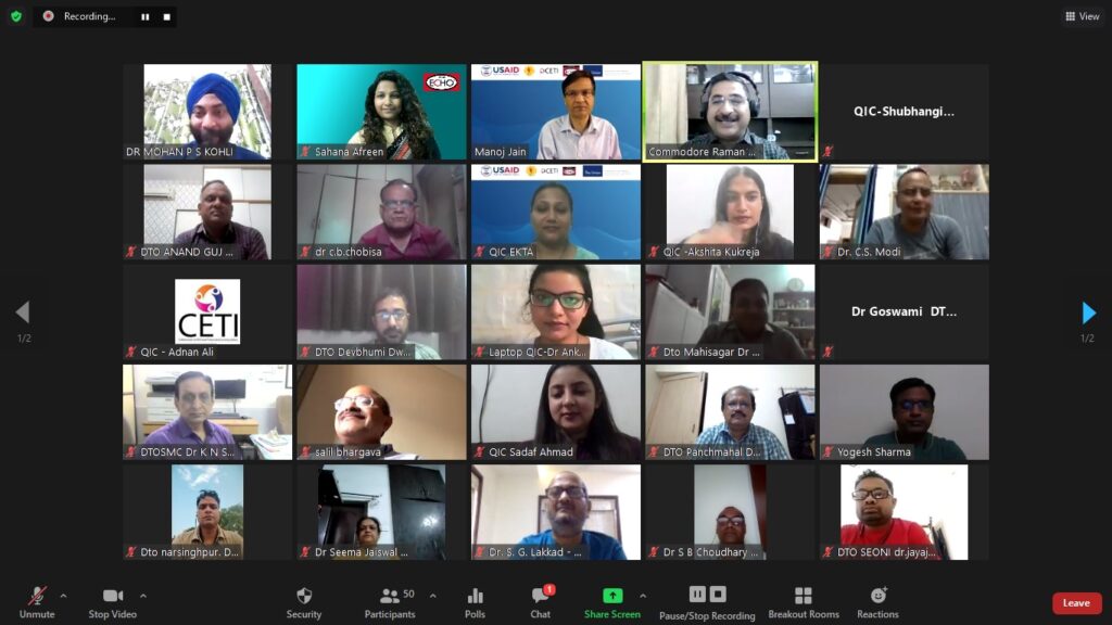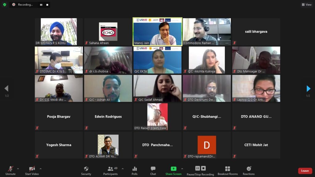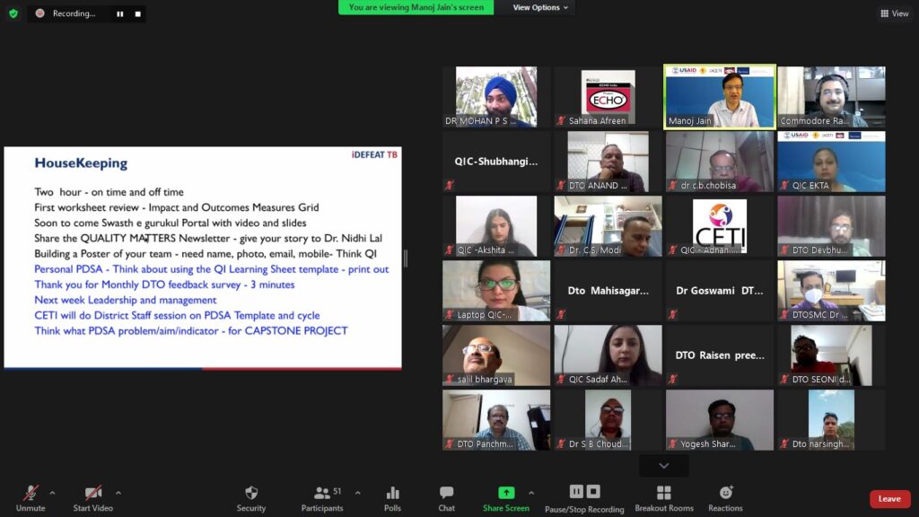 The weekend workshop on 08 and 09 May 2021 were mega sessions of five hours overall duration. The sessions were oriented towards Quality Improvement processes especially the PDSA technique. Though they were originally conceptualised to be in-person weekend sessions but due to ongoing covid-19 protocols were converted to virtual interaction. Despite being a weekend, the active and wholehearted participation by the DTOs was most encouraging. The technology of breakout rooms was largely utilised to give the QICs and their respective DTOs private space to practice the various steps involved in PDSA. The DTOs then made presentations and shared their experiences.