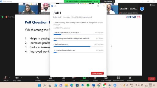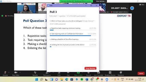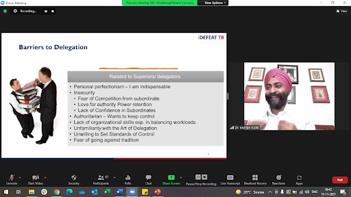 Mr. Kamal Kishore Chopra – Director New Delhi TB Centre was the guest discussant for the session on Delegation. The session focussed upon the significance of delegating the work to the subordinates in order to increase the overall efficiency of an organisation. The insecurities and apprehensions of a leader as also the pitfalls associated with delegation were also discussed and highlighted. Case studies and polls to garner DTO views were also conducted.