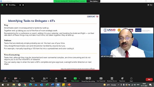 Dr Chopra, sharing his thoughts on delegation and brought out the practical aspects of delegation in the TB Program. He highlighted the aspects of authority, responsibility, appreciation and rotation of duties whilst delegating. He enumerated the kind of duties that could be delegated by a DTO as also how to monitor and supervise the delegated duties.