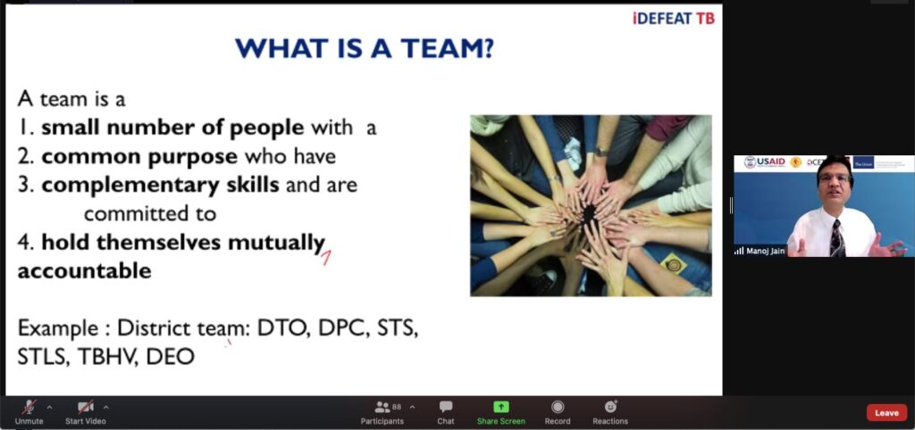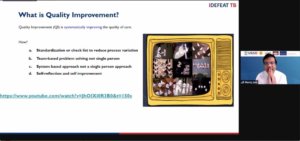 Moving ahead the session began with the first lecture on Quality Improvement (QI – 1) which involved topics like what is quality, how it relates to healthcare, indicators of quality and its utilisation in NTEP, impact and outcome measures, quality improvement, value- based healthcare, perspective of stakeholders in quality in TB, quality assurance vs. quality improvement. This was complimented with a glimpse of the Quality Improvement learning sheet.